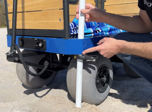 Crafted for convenience and peace of mind, these clamps ensure your beach umbrella stays securely anchored to your e-Beach Wagon even on the windiest of days. Simply affix the clamp to your umbrella pole just beneath the frame, and voila! Your beach setup is fortified against gusts and gustations.