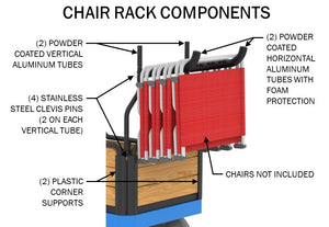 Versatile and adjustable, the vertical and horizontal tubes can be rotated to accommodate items of varying sizes. When it's time to transport your chairs, simply rotate the vertical tubes inward, allowing the horizontal tubes to slide through the chair frames with ease.